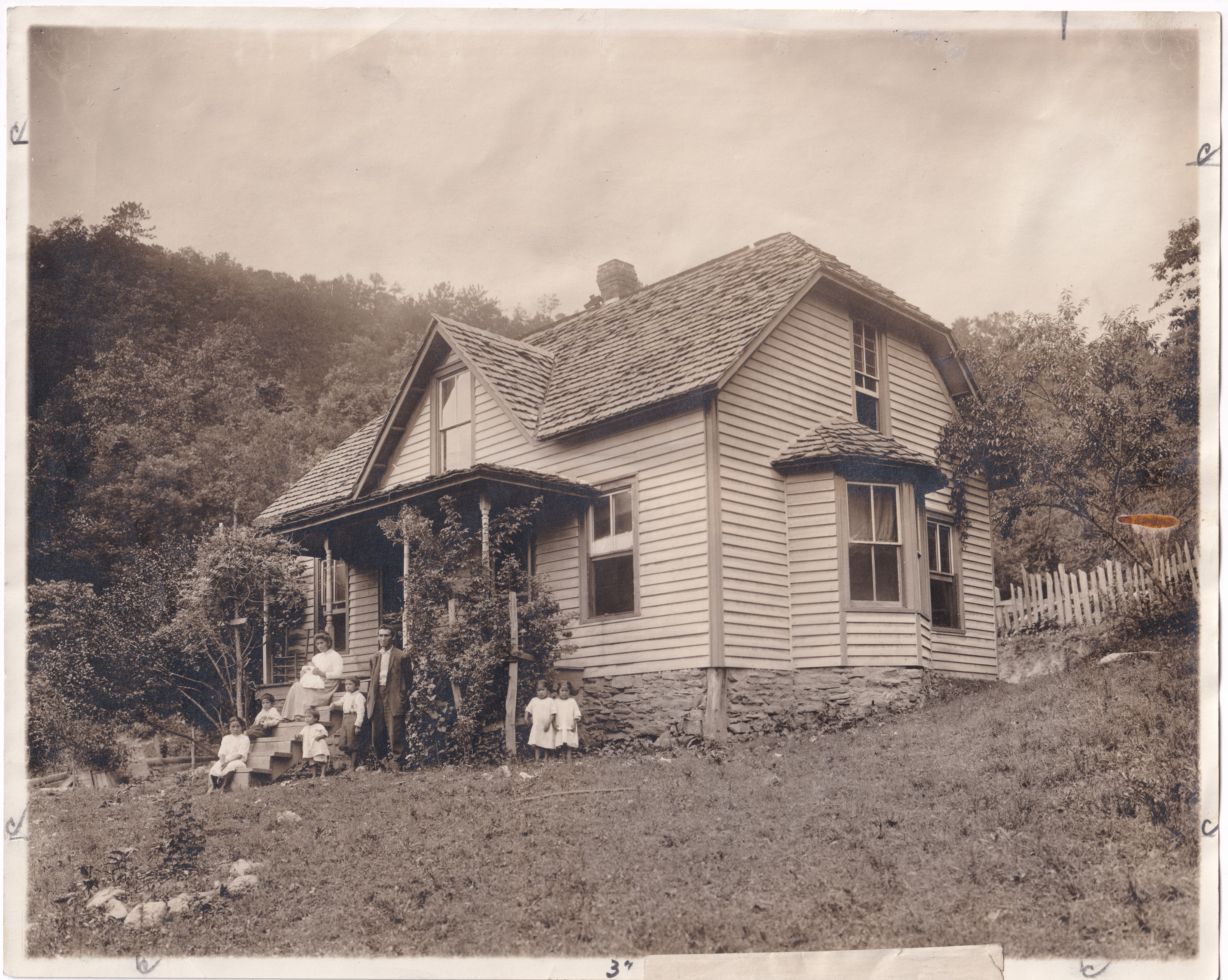 Annie George Tahquette holding an infant with John A. Tahquette and six children in front of their house in Cherokee, North Carolina.