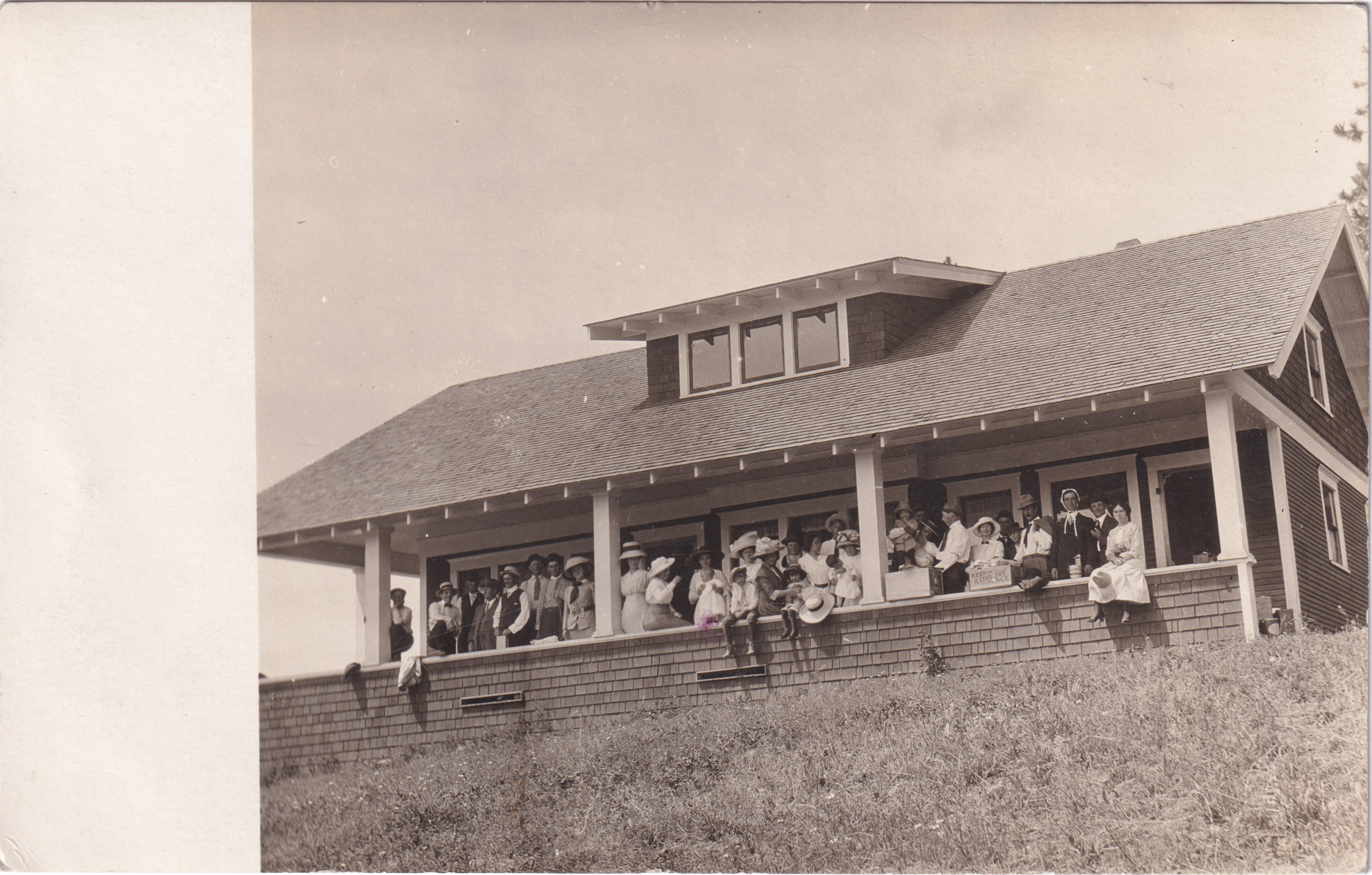 Crowd of people on the porch of the home of Clarence L. Butler.