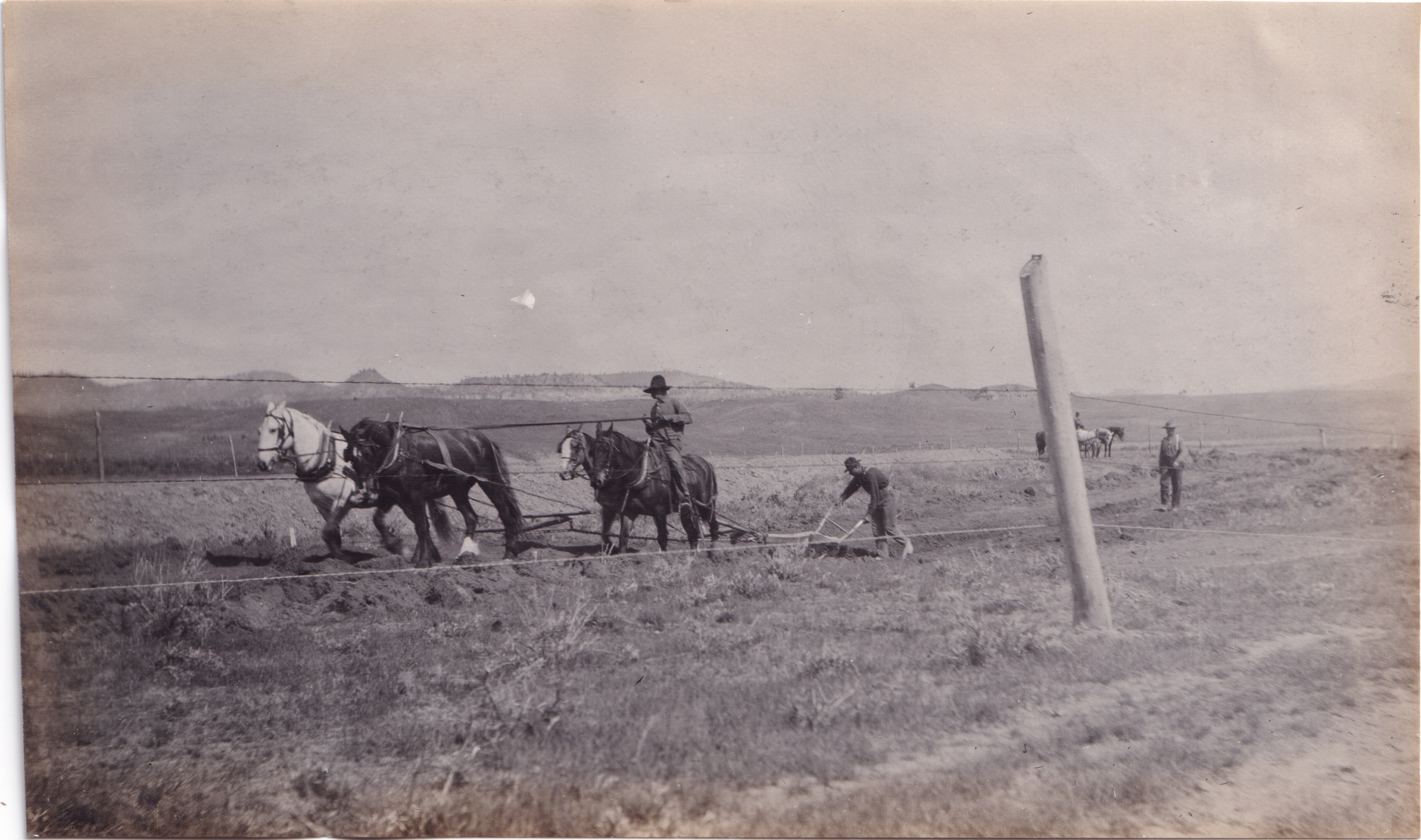 This photograph is of David Little Oldman plowing his field with the assistance of horses and another man.