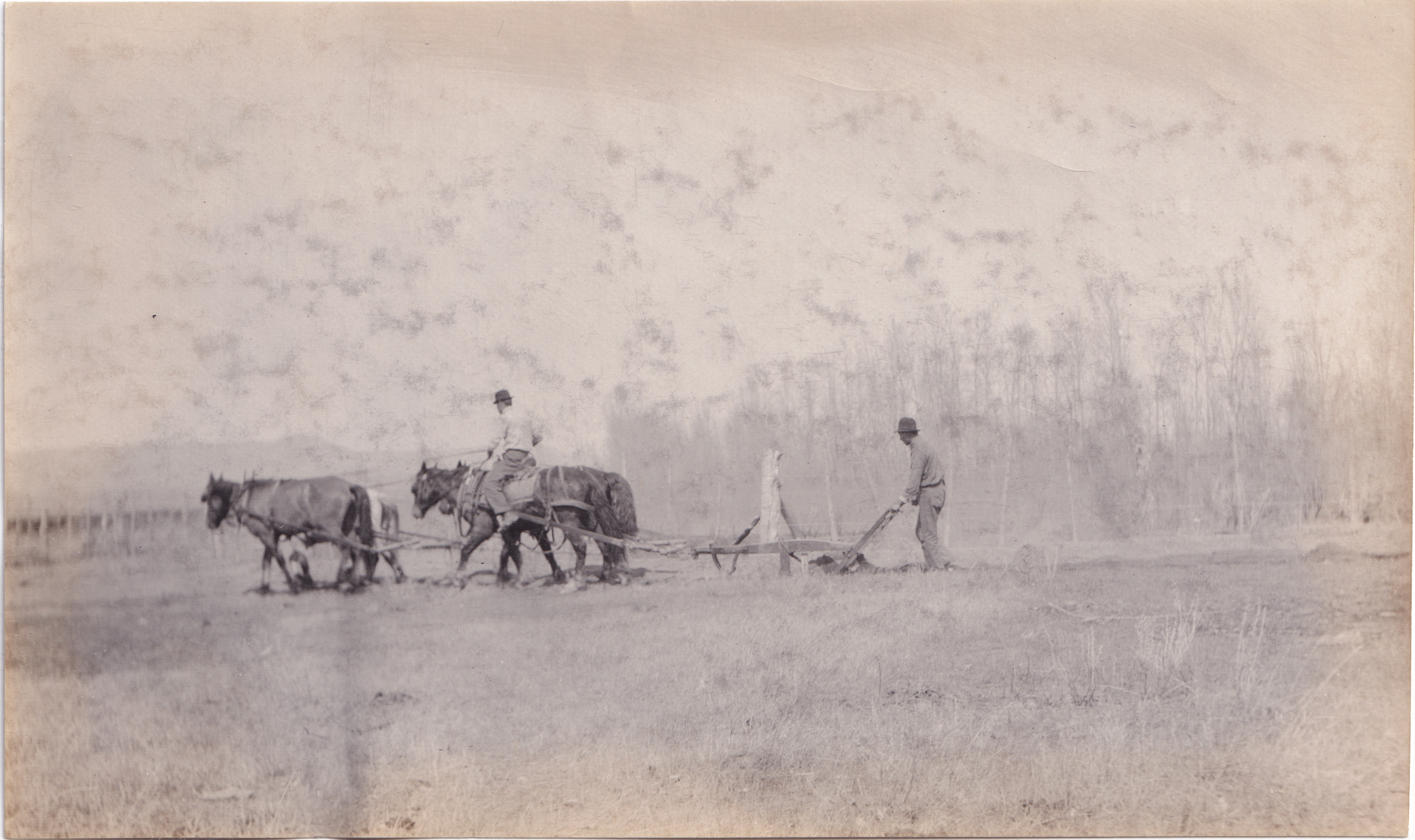This photograph is of David Little Oldman plowing his field with the assistance of horses and another man.