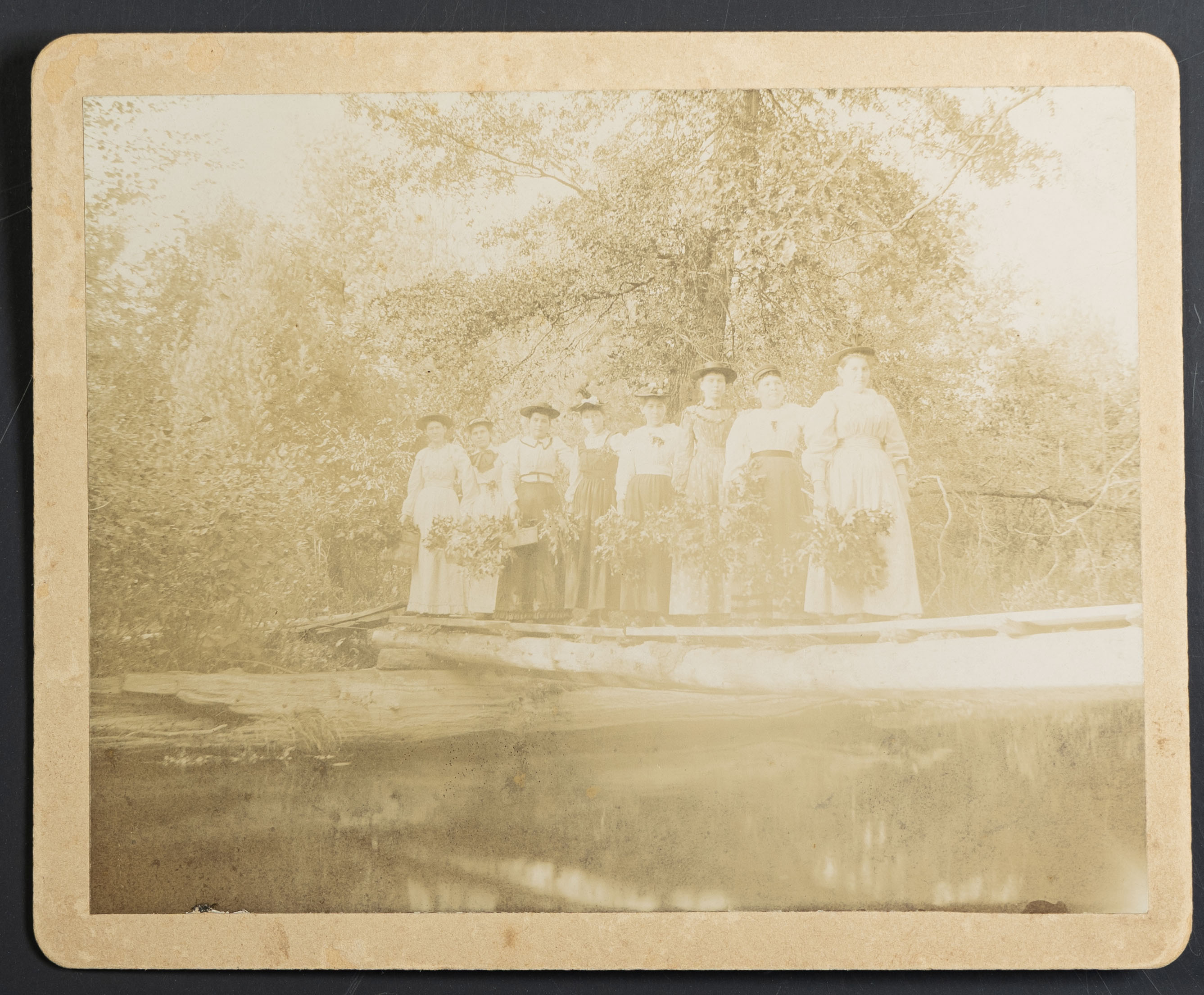 Eight female students, posed in a line on a bridge across what looks like a stream in the woods. Almost all of them are holding baskets containing flowers or greenery.