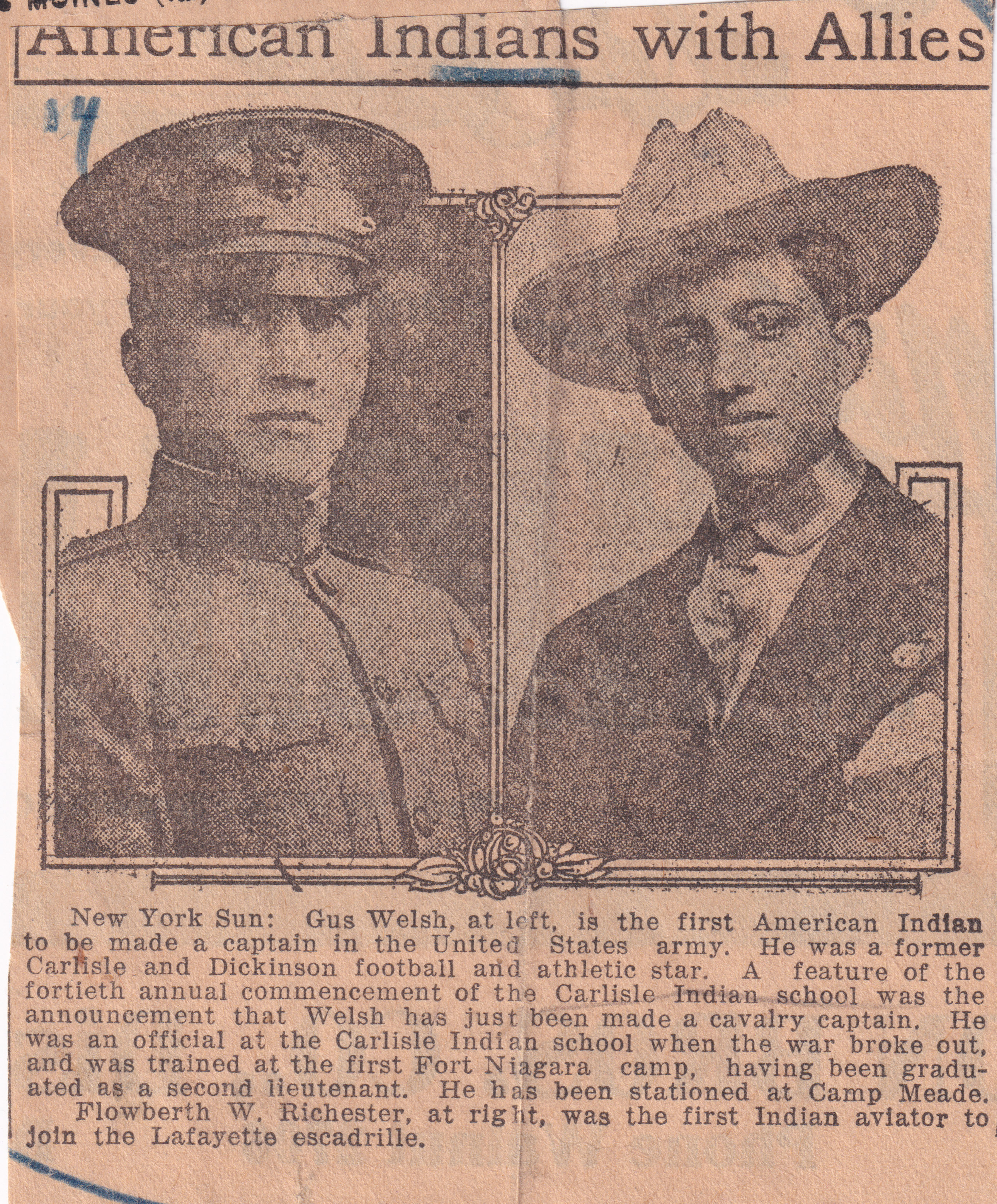 The article reads: New York Sun: Gus Welsh, at left, is the first American Indian to be made a captain in the United States army. He was a former Carlisle and Dickinson football and athletic star. A feature of the fortieth annual commencement of the Carlisle Indian school was the announcement that Welsh has just been made a cavalry captain. He was an official at the Carlisle school when the war broke out, and received his military training at the first Fort Niagara camp, have been graduated as a second lieutenant. He has been stationed at Camp Meade.