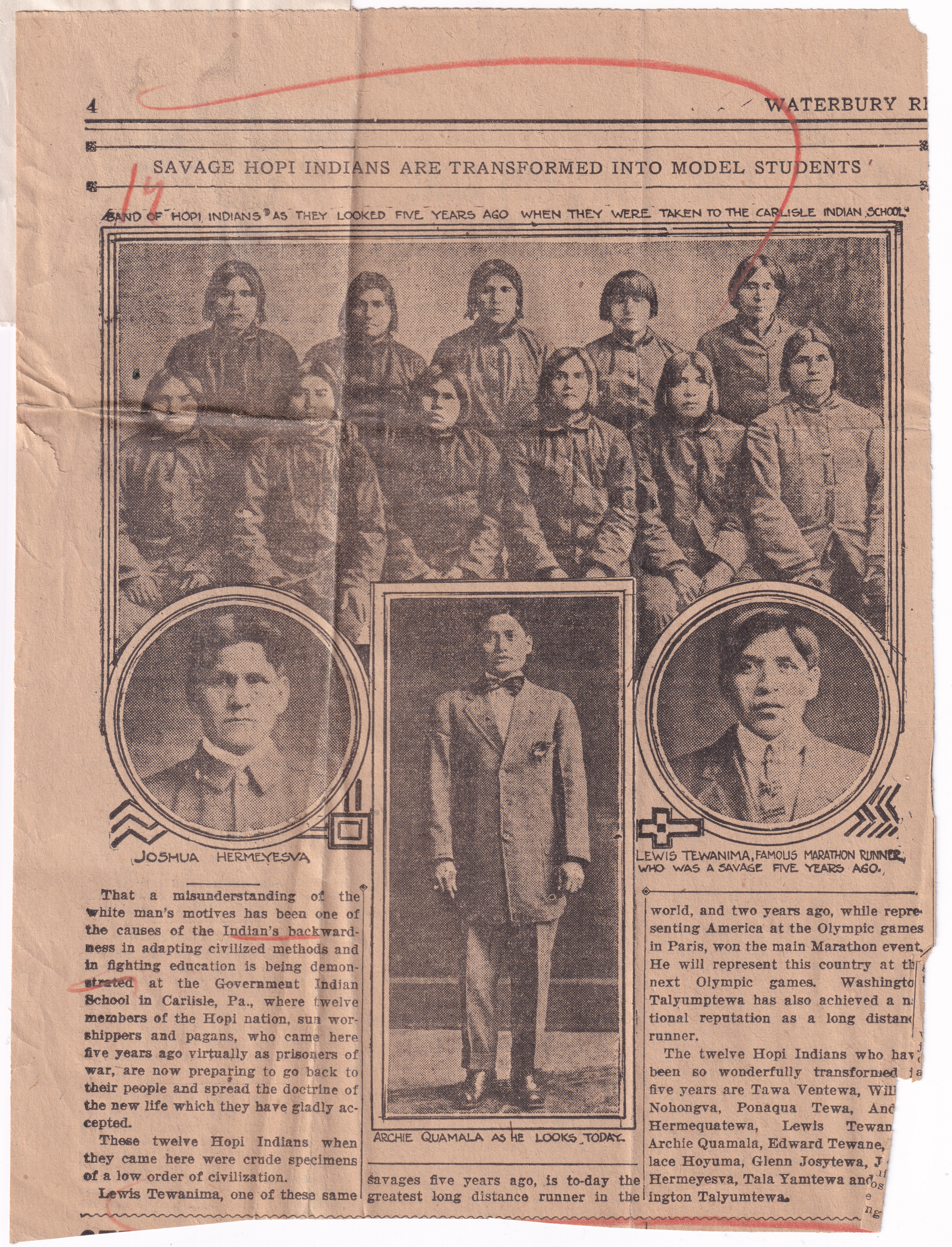 The sub-captions over the individual pictures read (top, then left to right): BAND OF HOPI INDIANS AS THEY LOOKED FIVE YEARS AGO WHEN THEY WERE TAKEN TO THE CARLISLE INDIAN SCHOOL; JOSHUA HERMEYESVA; ARCHIE QUAMALA AS HE LOOKS TODAY; LEWIS TEWANIMA, FAMOUS MARATHON RUNNER, WHO WAS A SAVAGE FIVE YEARS AGO.