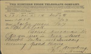 Samuel Chapman Armstrong of the Hampton Institute telegraphs Richard Henry Pratt asking if he can speak at a church in Boston in a few days.