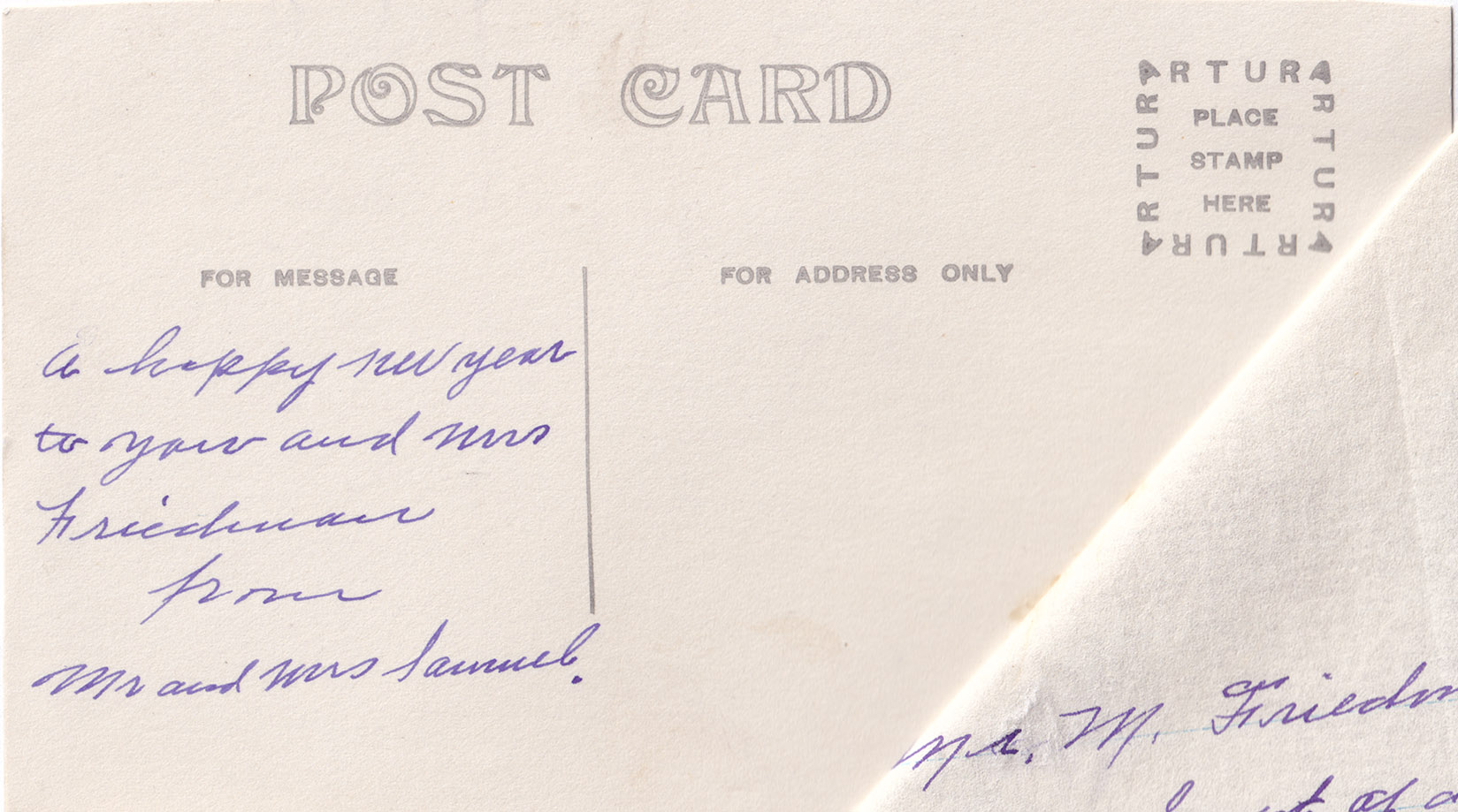 The handwritten note on the reverse side reads: A happy new year to you and Mrs Friedman from Mr and Mrs Samuel.